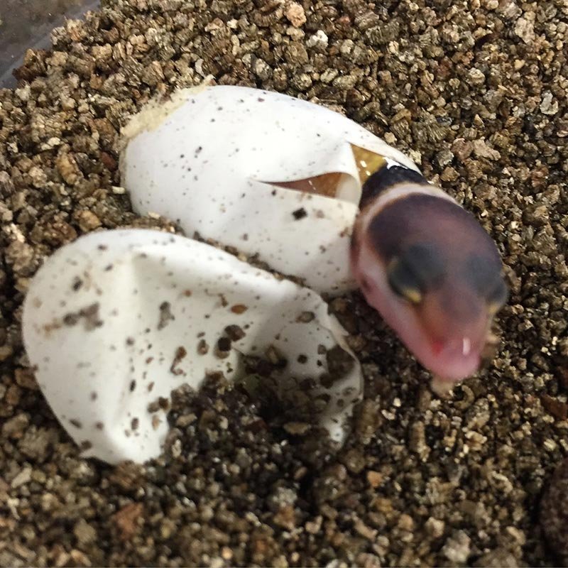 With the vast majority of species (namely those with soft-shelled eggs), the egg will dimple and then begin to collapse shortly before hatching. This is a sign that hatching is imminent, and you should prepare facilities for the babies at this time if you have not already done so.