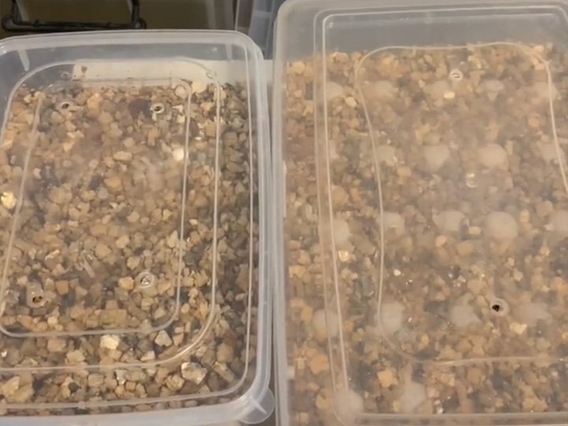 Then, place the moistened vermiculite into your incubation container. The desired amount should be able to cover all the eggs about 1/2 – 2/3s of the way up. This ensures that the eggs will have a nice resting spot with ample humidity levels during the entire incubation process. A pinhole can be made in the container for air exchange but you can also simply open it once every few weeks for a moment.
